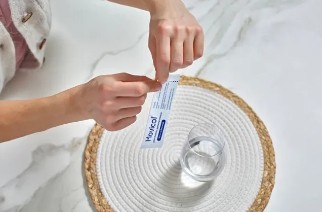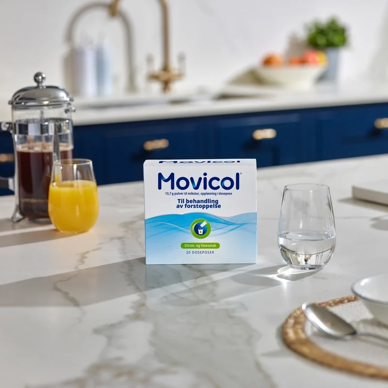 Movicol®er et avføringsmiddel mot forstoppelse. Det virker ved å føre vann inn i tarmen, så avføringen blir bløtere, fyldigere og lettere å få ut. Movicol® fås reseptfritt på apotek.
